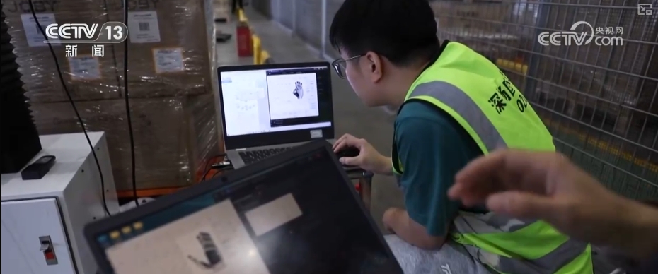 在深圳宝安机场的国际货站,一家机器人企业正在调试他们的机器手,测试这款机器手产品是否可以在机场货物分拣场景中使用。